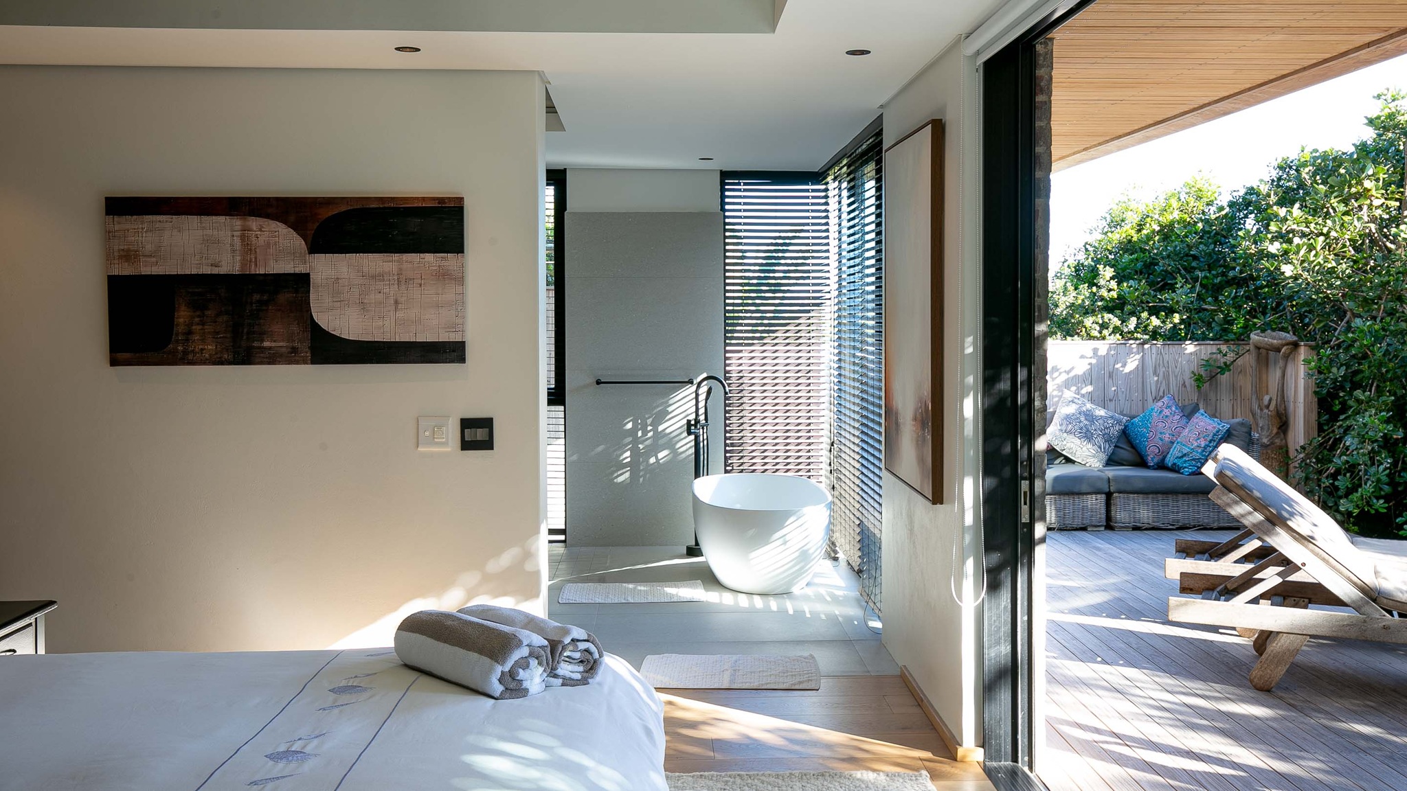 Main bedroom en-suite (upstairs):• King size bed extra length• Large glass sliding pocket doors• Spectacular views of the beach and ocean• En suite bathroom with shower, double basin, bath and toilet• Spacious wardrobe• Heated towel rails• Underfloor heating in bathroom• Hair dryer provided• Quality cotton linen and towels• Pool-, bath-, hand towels and face cloth• Shower gel, shampoo and soap