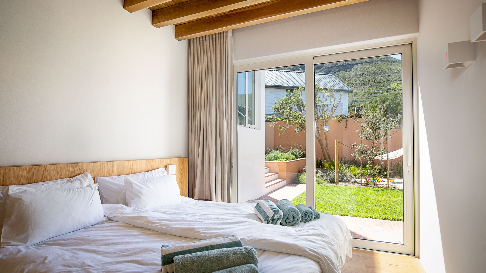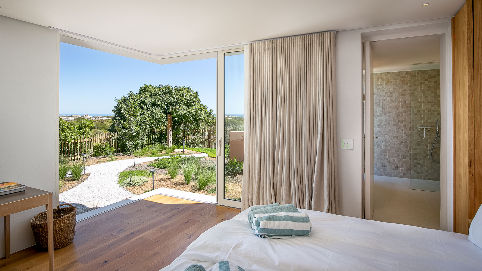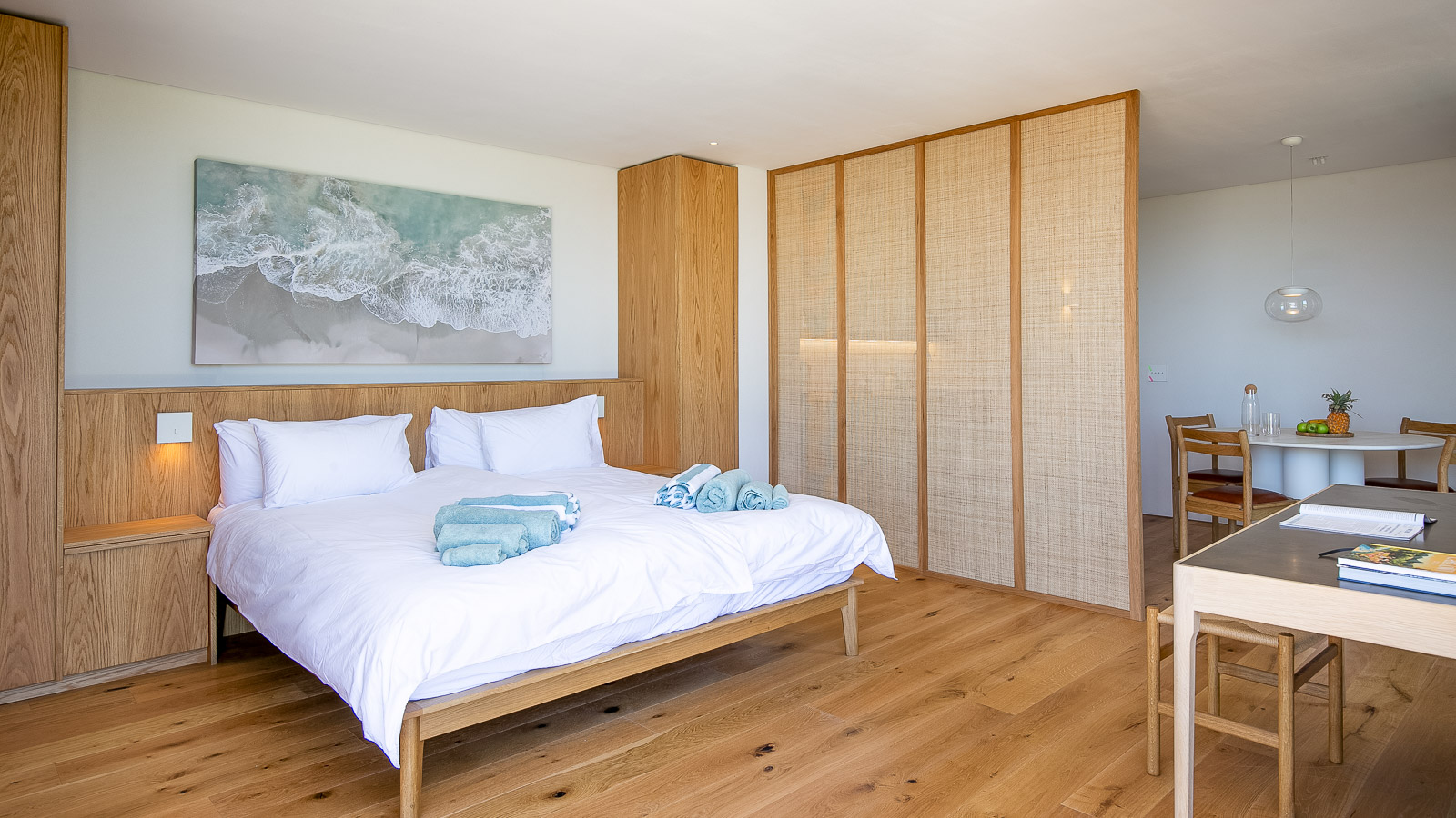 ![]() ![]() | Fourth bedroom en-suite (downstairs apartment) • King size bed extra length • Large glass sliding pocket doors • Spectacular views of the beach and ocean • Direct access to garden with outdoor table and 2 chairs • Spacious wardrobe • Desk • Well equipped kitchenette with bar fridge, Nespresso machine, kettle, toaster, cutlery • Dining table with 4 chairs • En suite bathroom with shower, basin and toilet • Heated towel rails • Underfloor heating in bathroom • Hair dryer provided • Quality cotton linen and towels • Pool-, bath-, hand towels and face cloth • Shower gel, shampoo and soap |
