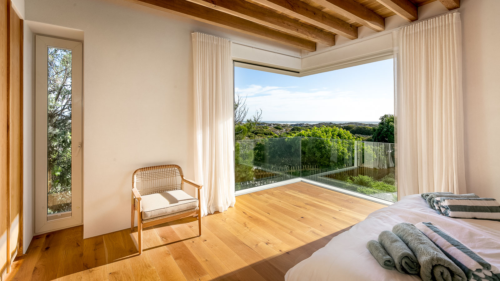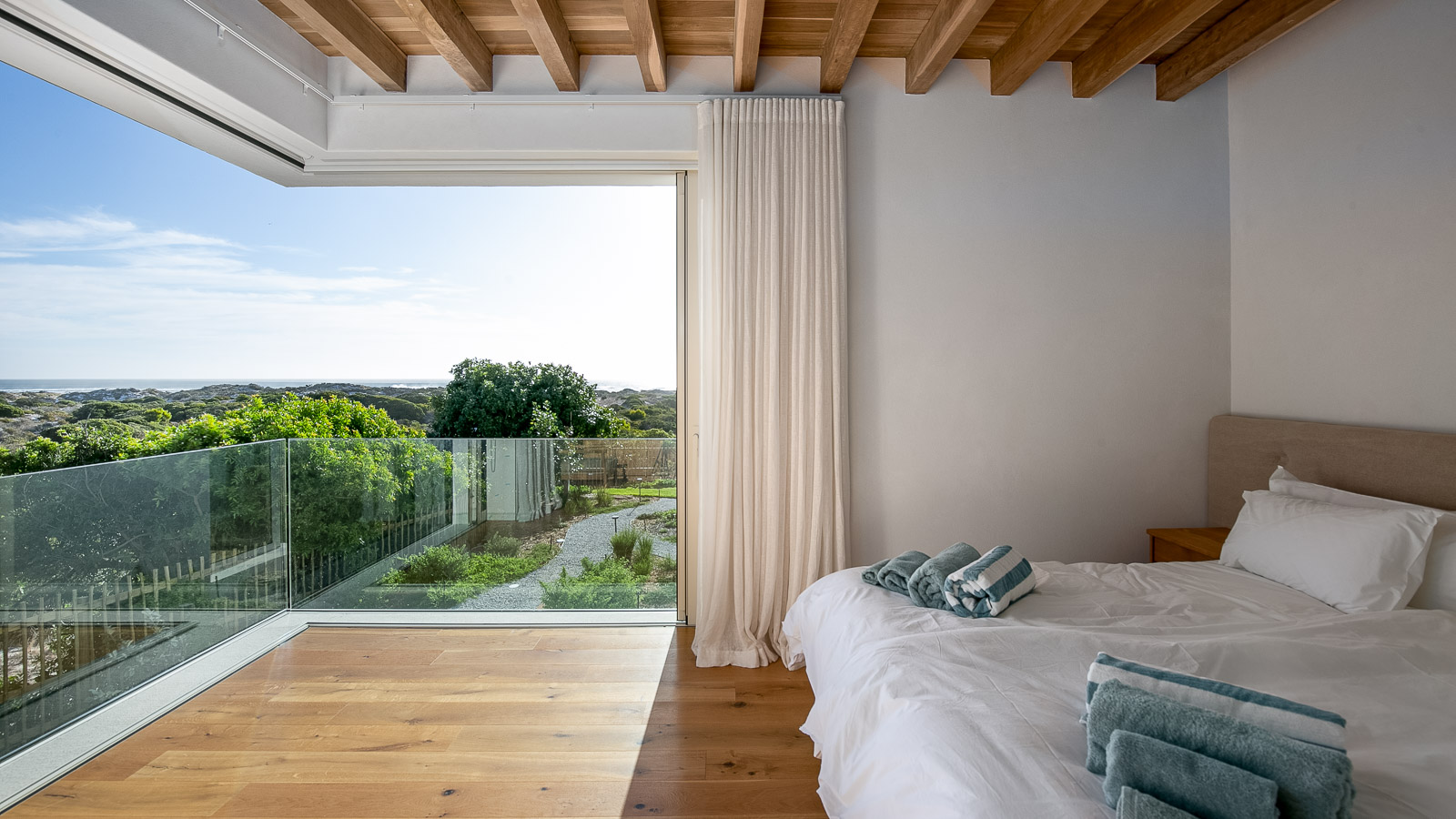 ![]() ![]() | Main bedroom en-suite (upstairs): • King size bed extra length • Large glass sliding pocket doors • Spectacular views of the beach and ocean • En suite bathroom with shower, double basin, bath and toilet • Spacious wardrobe • Heated towel rails • Underfloor heating in bathroom • Hair dryer provided • Quality cotton linen and towels • Pool-, bath-, hand towels and face cloth • Shower gel, shampoo and soap |