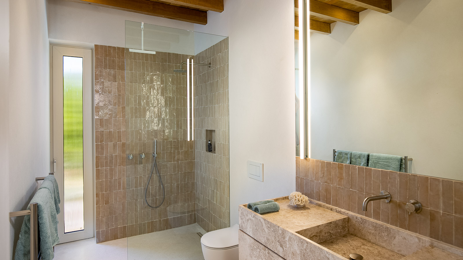 ![]() | Second bathroom (upstairs): • Shower, basin, toilet • Heated towel rails • Underfloor heating • Hair dryer provided • Quality towels • Pool-, bath-, hand towels and face cloth • Shower gel, shampoo and soap |