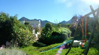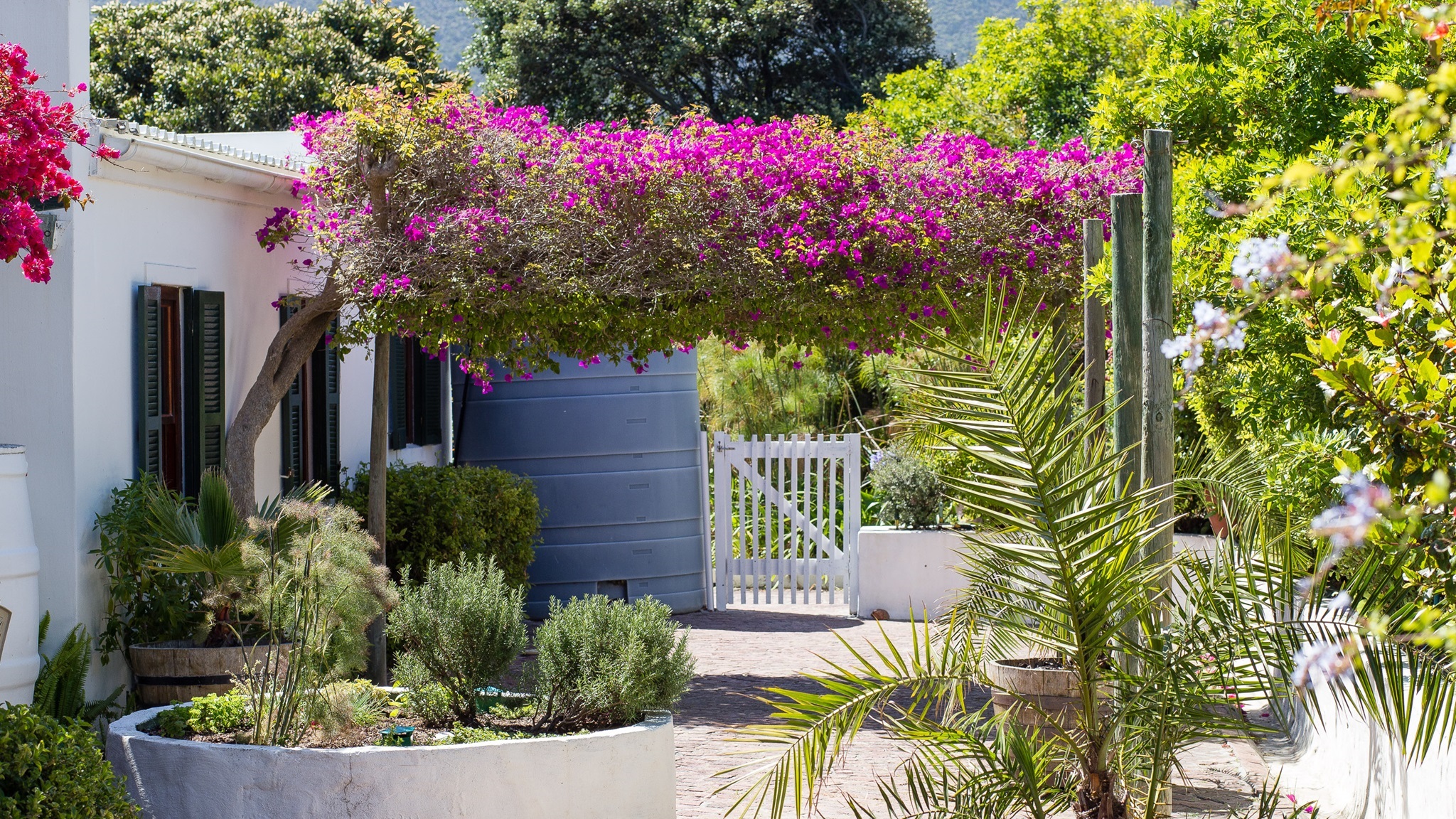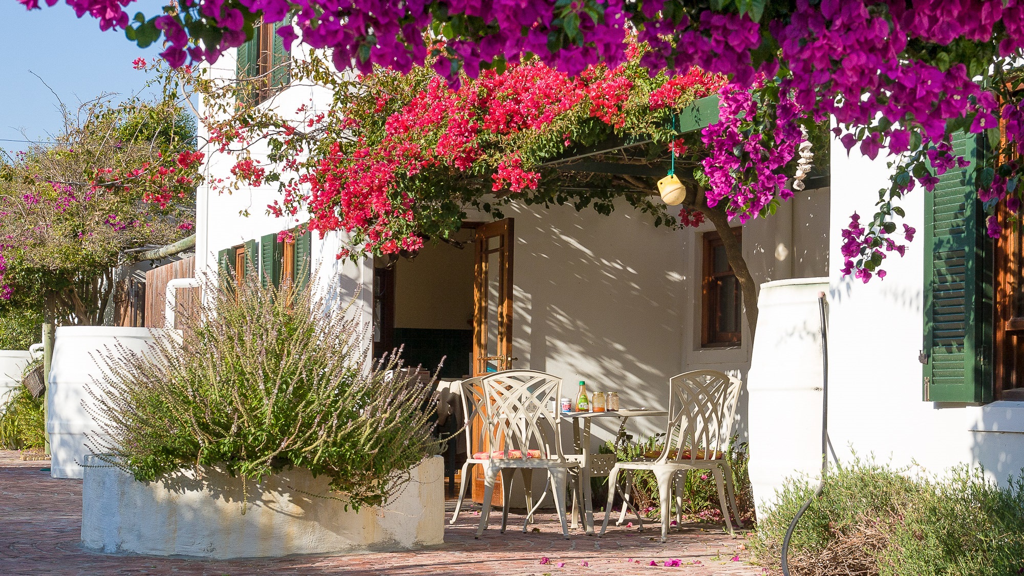 Except a few rose bushes the whole garden is planted with typical flowers and bushes from the Cape and South Africa. And of course, you’ll also find the well known pincushin proteas and many other acquaintances from your excursions through the nature reserves close by.