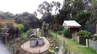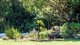 Enjoy a cup of tea in the pavilion and gaze at the blossom sea around around you. The colorful pincushin proteas which attract the sunbirds are special attraction in this part of the garden. And if you would like a lemon for your tea: Our lemon trees are also part of this section. The large pond is home of some froggs and colourful water lilies.