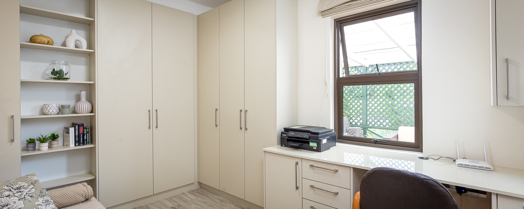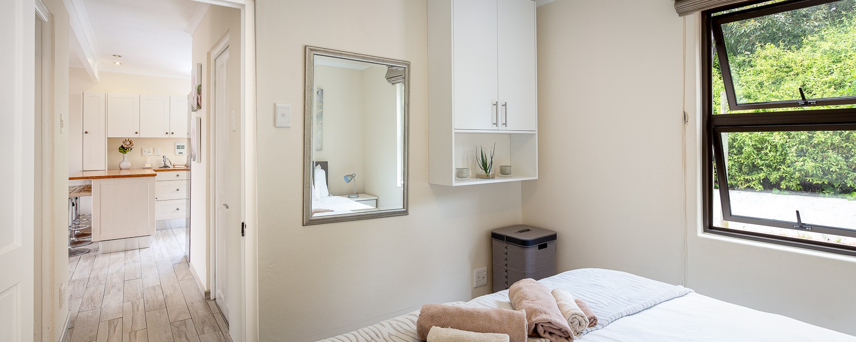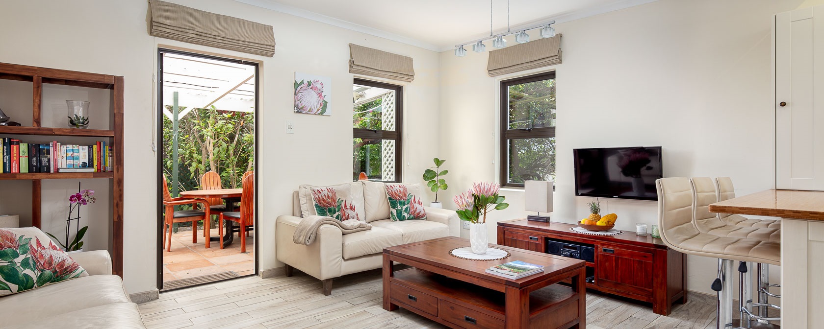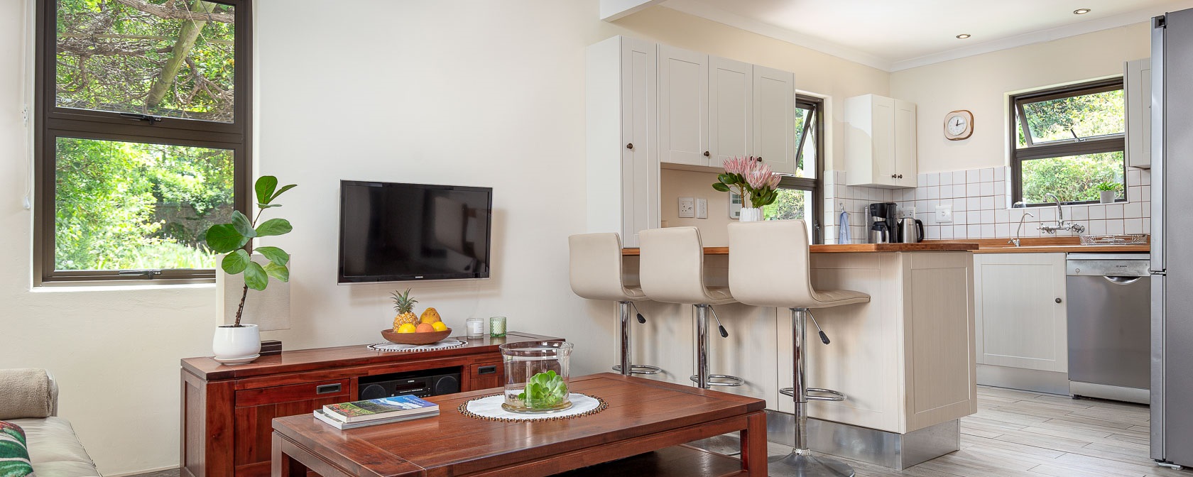 Noordhoek Garden Cottage consists of a bedroom with a queen size bed and a 2nd bedroom with a sofa bed and an office workstation for catching up on some work. The comfortable living room with 2 leather couches and a coffee table flows into the kitchen in an open plan style. With all the outdoor dining tables in mind, we’ve placed high chairs around the extended kitchen counter for the summer months. During winter we provide a dining table and 4 chairs for the cottage.