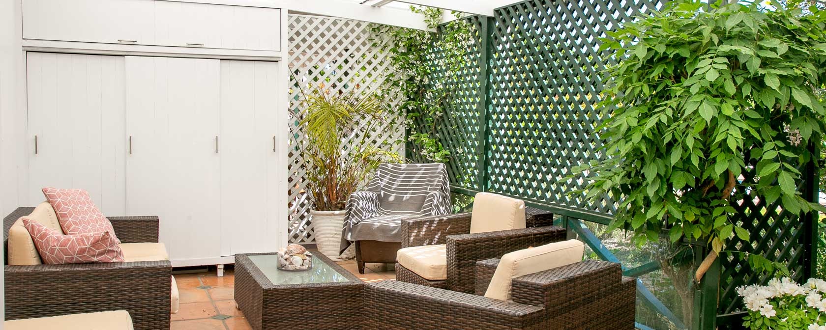 The cottage has a 25 m² veranda with outdoor seating and a 6 seater dining table.