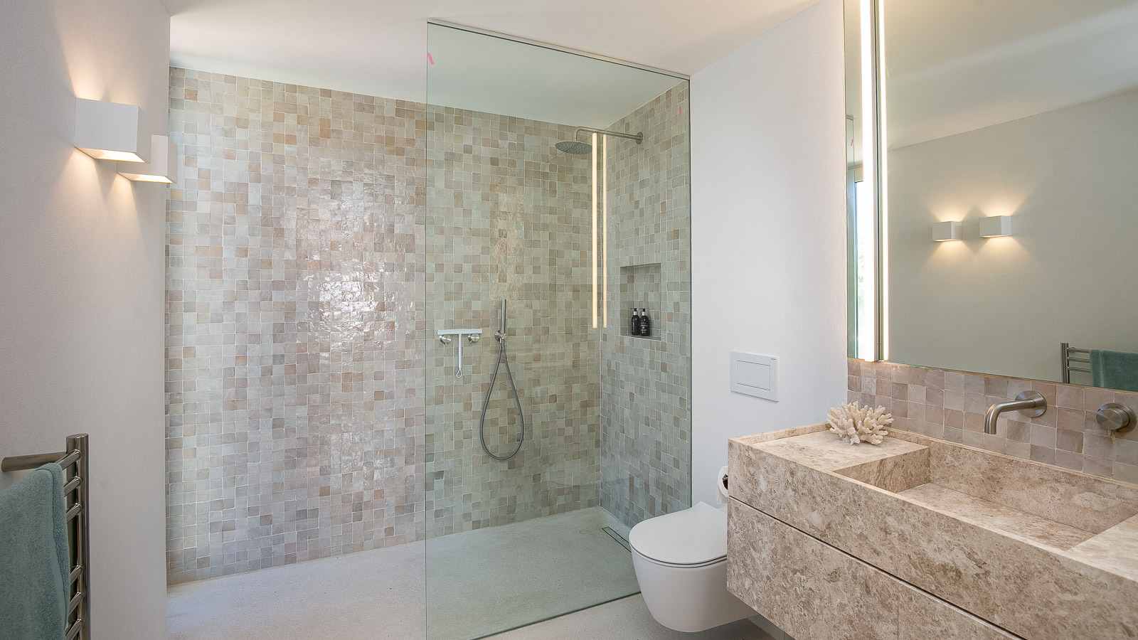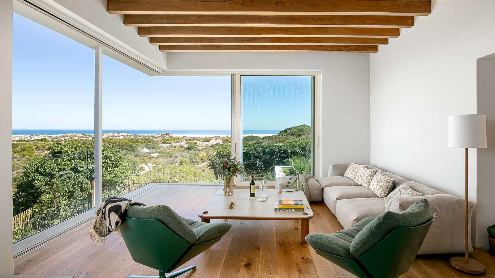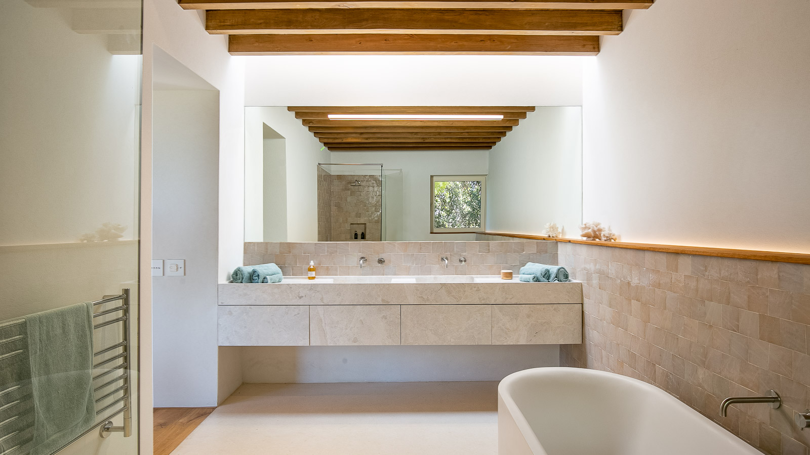 ![]() ![]() | Main bedroom en-suite (upstairs): • King size bed extra length • Large glass sliding pocket doors • Spectacular views of the beach and ocean • En suite bathroom with shower, double basin, bath and toilet • Spacious wardrobe • Heated towel rails • Underfloor heating in bathroom • Hair dryer provided • Quality cotton linen and towels • Pool-, bath-, hand towels and face cloth • Shower gel, shampoo and soap |