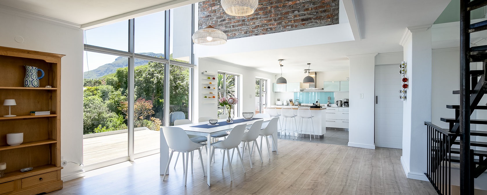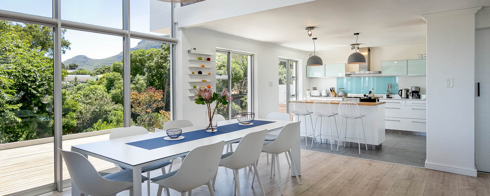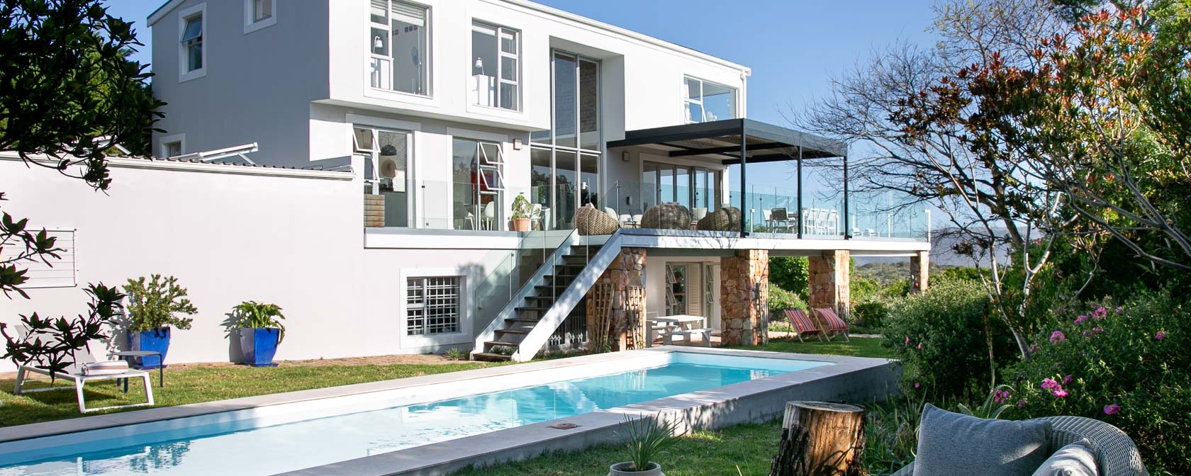 Well positioned high up on the slopes of the Silvermine Nature Reserve, this modern self-catering villa offers breathtaking views of the whole coastline and the lush greenery of the mountains.