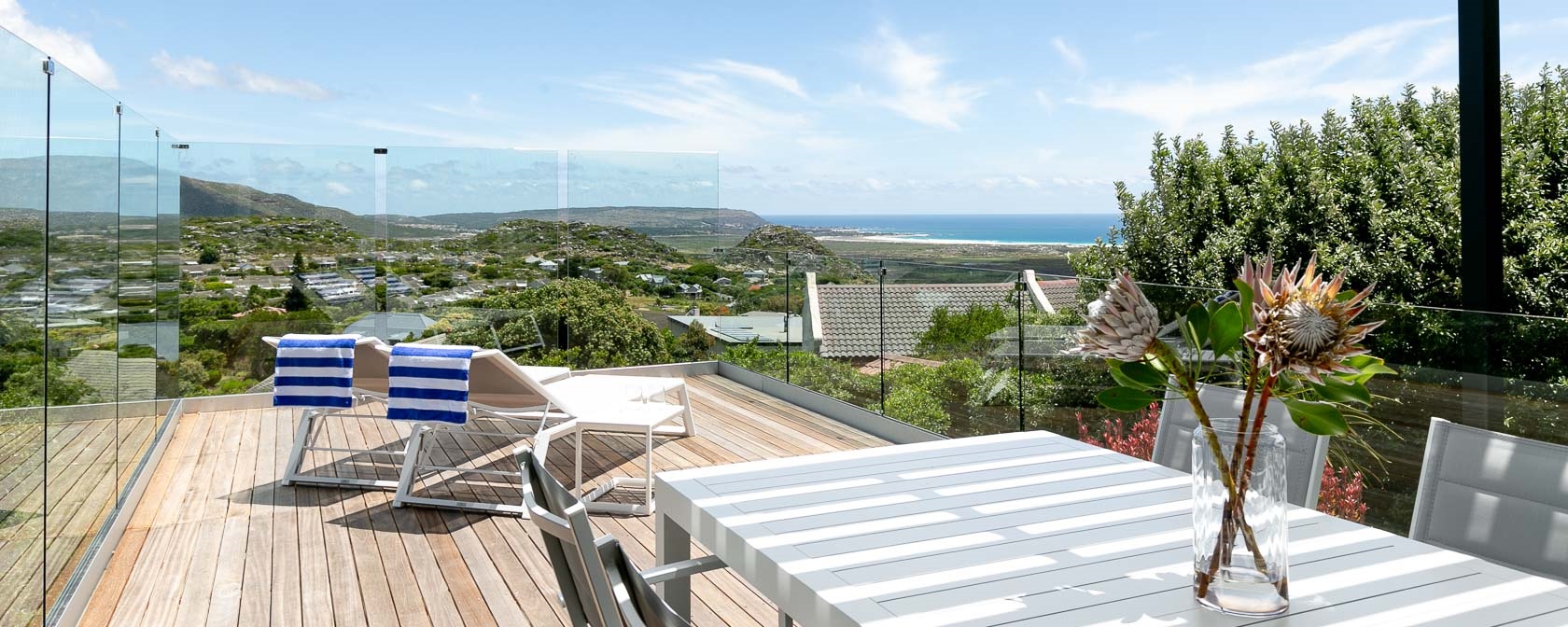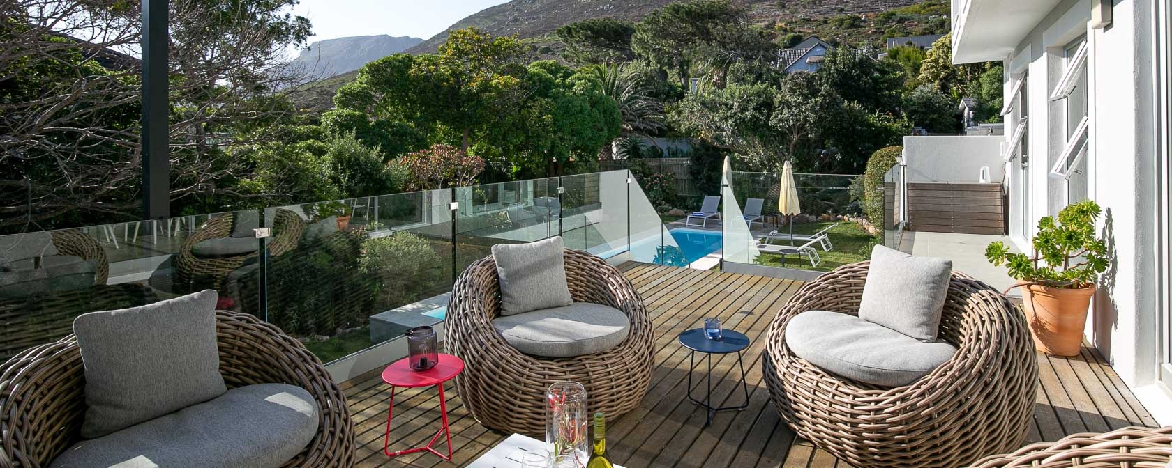 The villa offers a seamless flow between indoor and outdoor areas. Large sliding glass doors open to a huge veranda with a louvered roof, where you decide if you want to let the sun flood in or rather have some shade. The veranda is surrounded by glass panels to ensure uninterrupted views of the scenery and the African sunsets. The panoramic views are unique as they extend over 270° – from the mountains of the Silvermine Nature Reserve, over the landmark Chapman’s Peak, the Atlantic Ocean with famous Noordhoek Beach, up to Kommetjie and further over the Peninsula to Fish Hoek and the False Bay. Relax on the veranda in the comfortable seating area, on two sun loungers or enjoy your meal at the large 8-seater outdoor dining table.