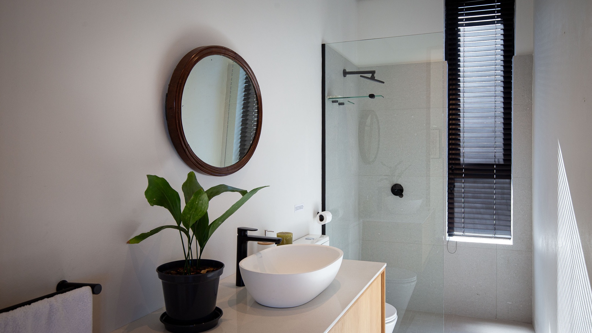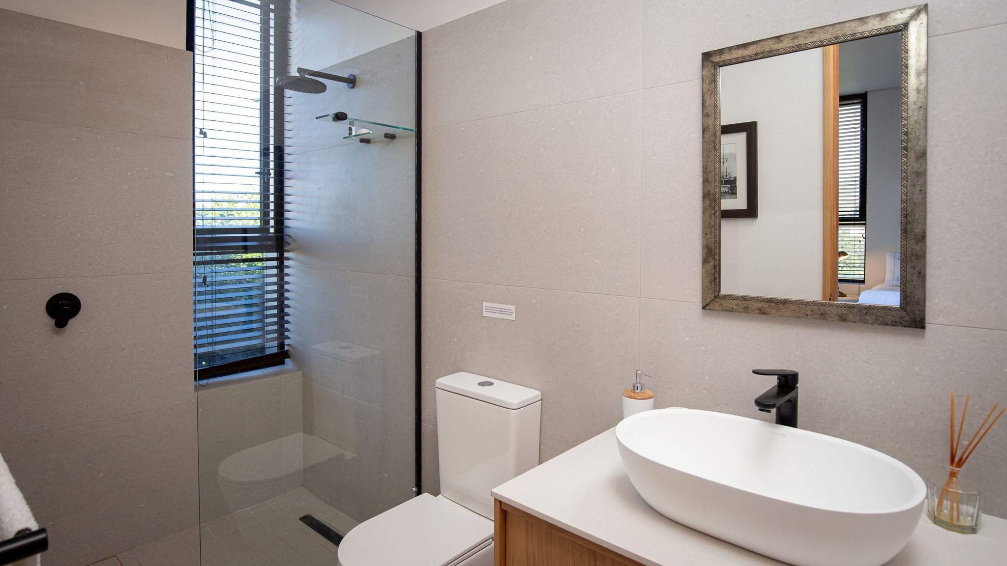 ![]() | Second bedroom en-suite (downstairs): • King size bed extra length • Large glass sliding doors • Access to the garden with deck and pool • Air conditioning • Underfloor heating (bedroom and bathroom) • En suite bathroom with shower, basin and toilet |