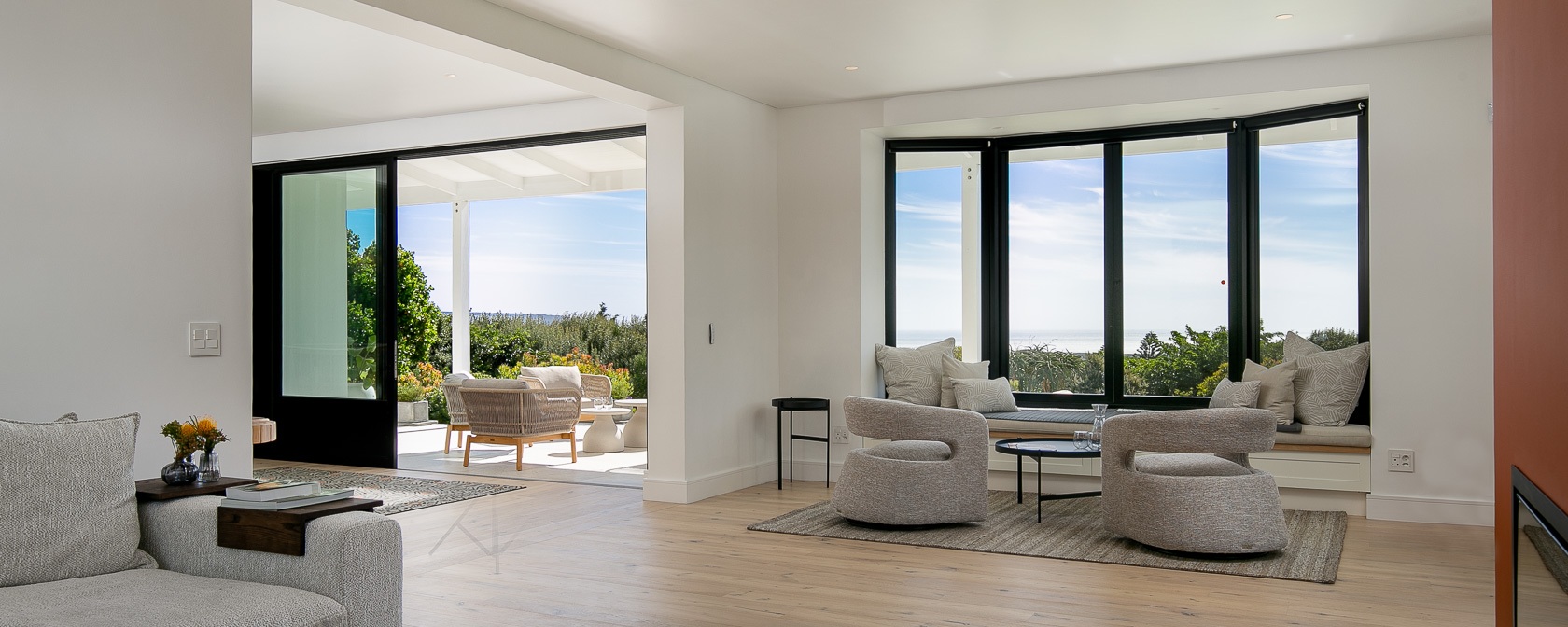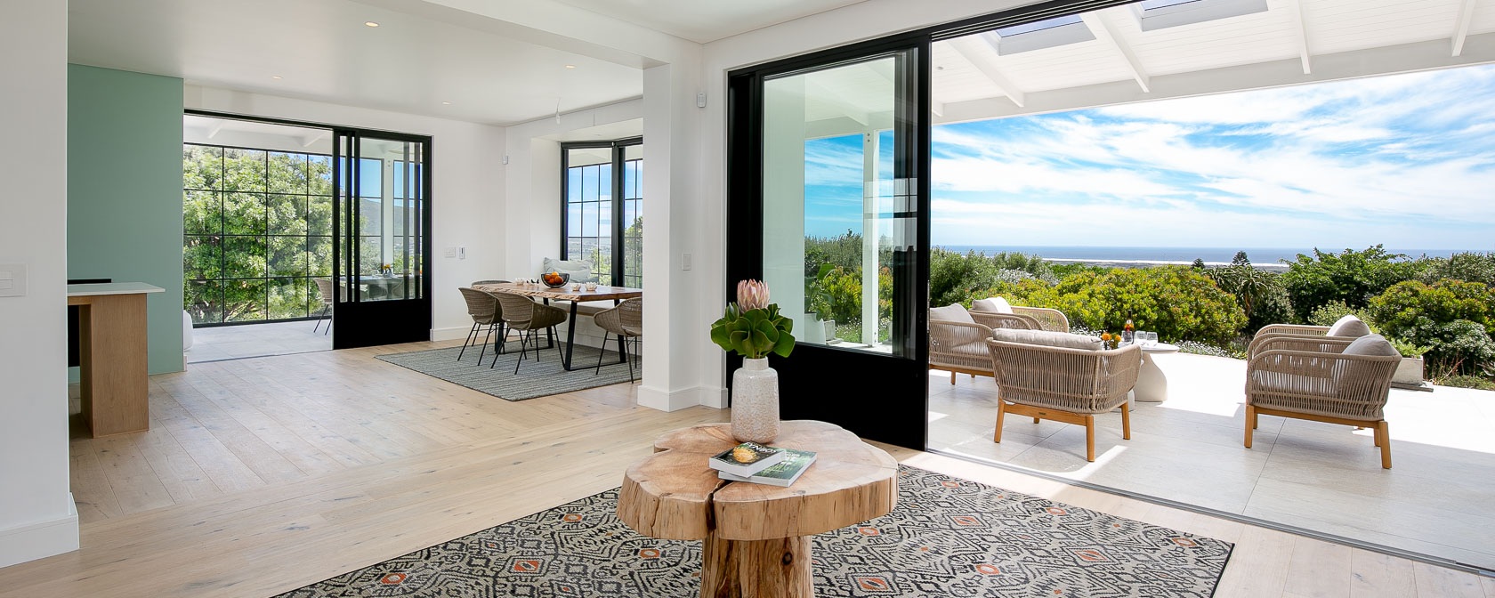 Set within one of Noordhoek’s most spectacular indigenous gardens, the house opens towards sweeping, uninterrupted views of the ocean, the beach, and the surrounding mountains—including the iconic silhouette of Chapman’s Peak. Floor-to-ceiling windows, expansive sliding doors and luminous interiors create an atmosphere of lightness and serenity, making it feel as though you are far removed from daily life—immersed instead in pure nature.